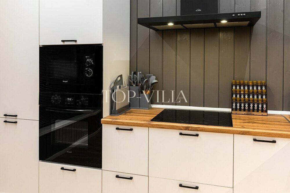 полностью оборудованная кухня с современной техникой: посудомоечная машина, микроволновая печь, духовой шкаф, вытяжка, чайник, необходимая посуда на 10-12 персон